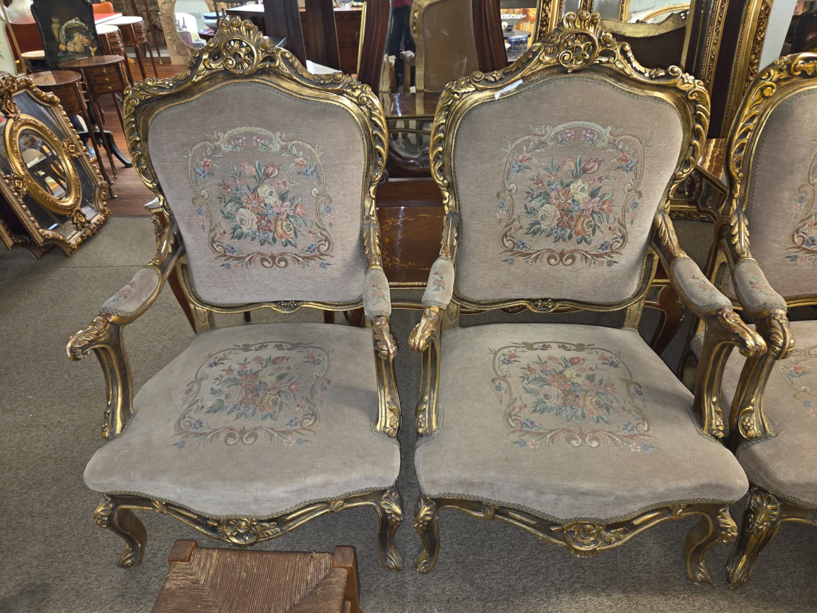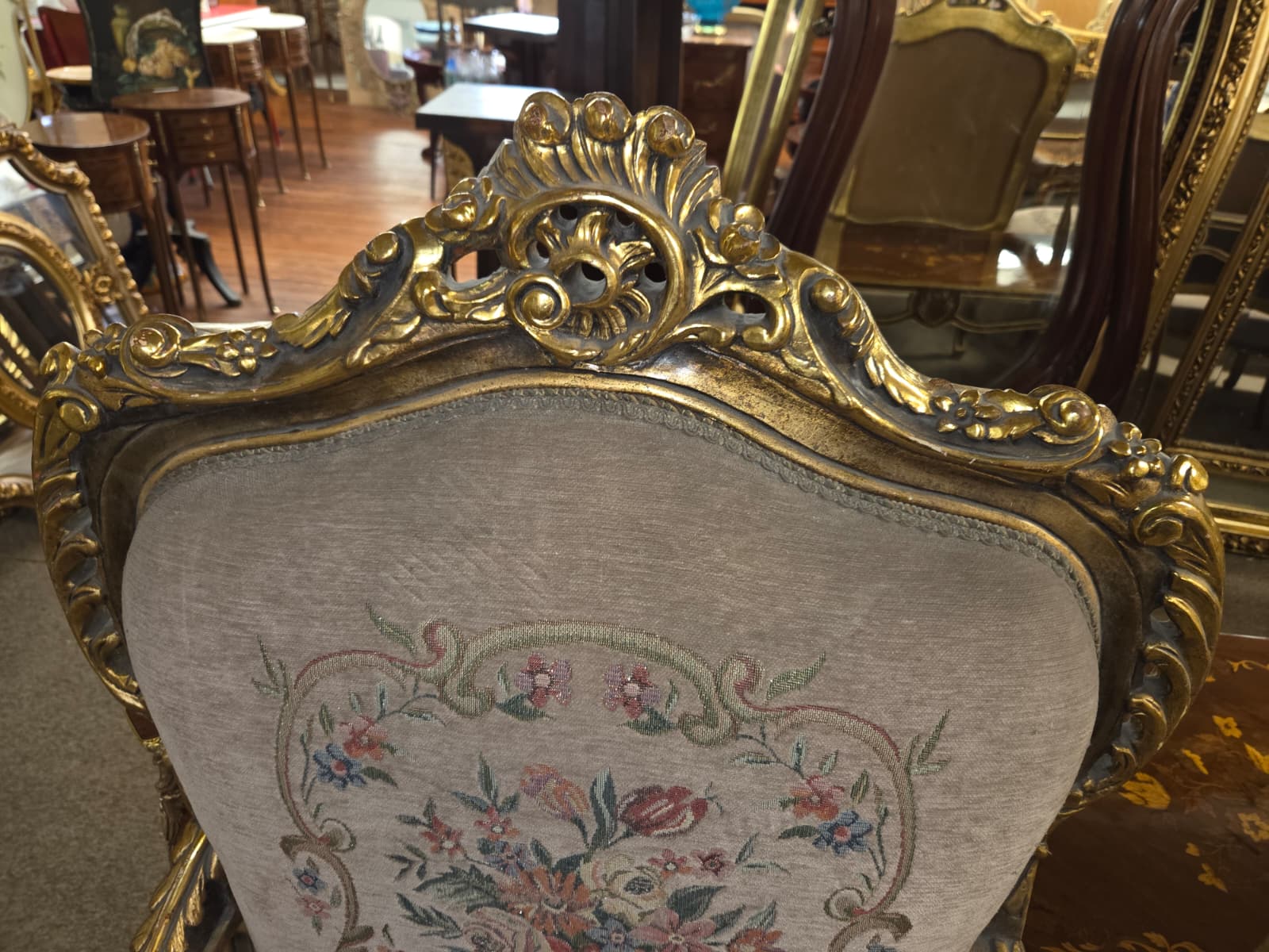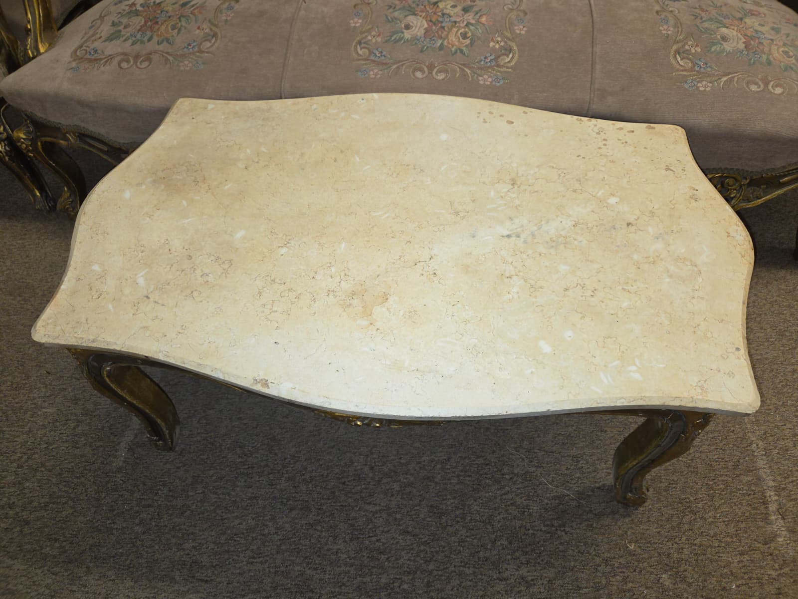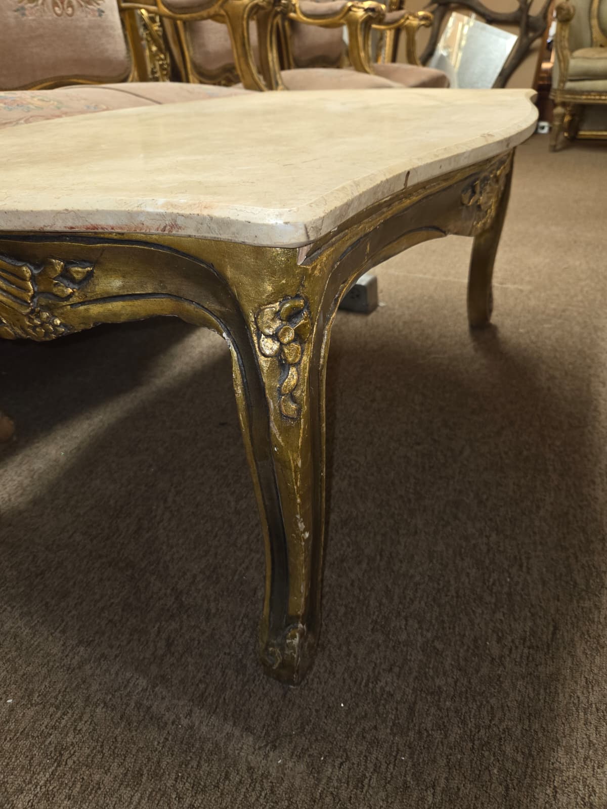 This exquisite Louis XV style salon suite exemplifies Rococo Revival elegance with its hallmark features. The set showcases intricately carved giltwood frames adorned with scrolling details, acanthus leaf motifs, and ornamental crests. Seating is upholstered in traditional floral needlepoint tapestry on a neutral beige and taupe ground, creating a sophisticated, cohesive aesthetic. The accompanying French Provincial marble top table features a thick, beveled slab of creamy Crema Marfil marble with subtle veining, supported by an ornately carved wooden base. This coordinated collection represents refined period craftsmanship ideal for formal living spaces or collectors of authentic antique furnishings.