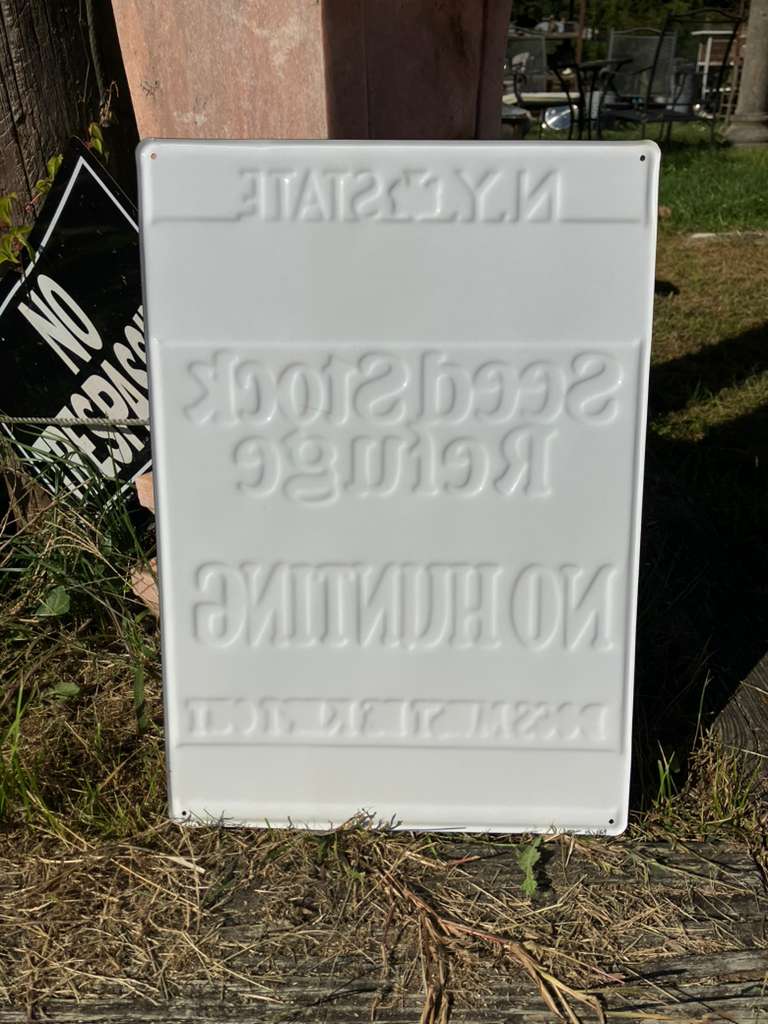 Design: “N.Y. State Cooperative Game Management Area – Seed Stock Refuge – No Hunting – Dogs Must Be Kept Out”